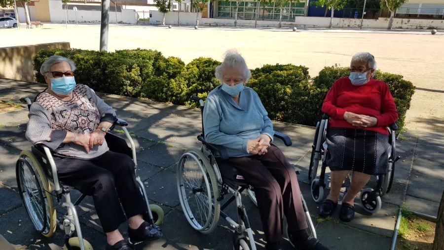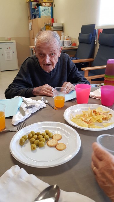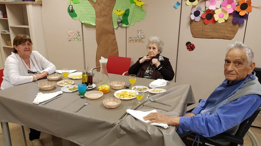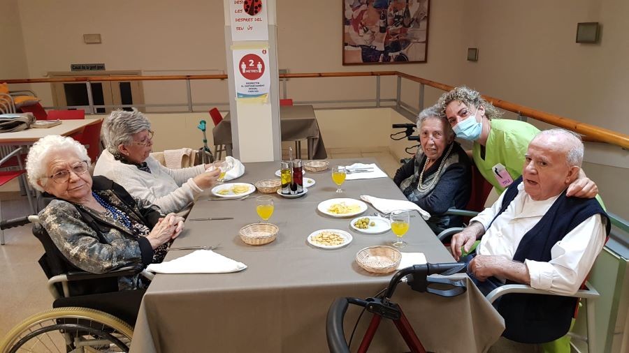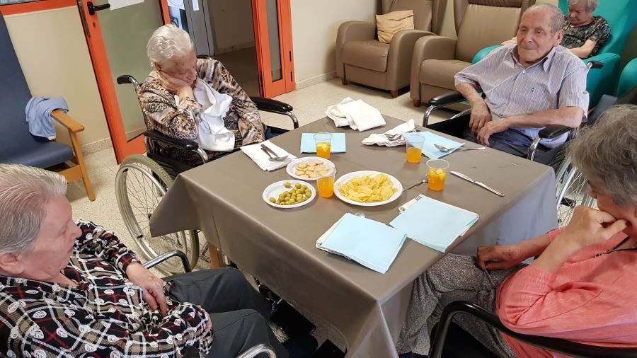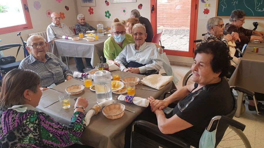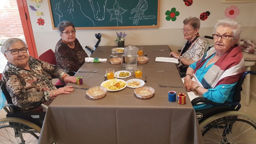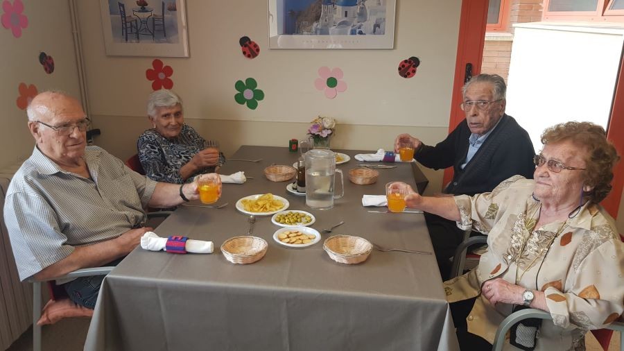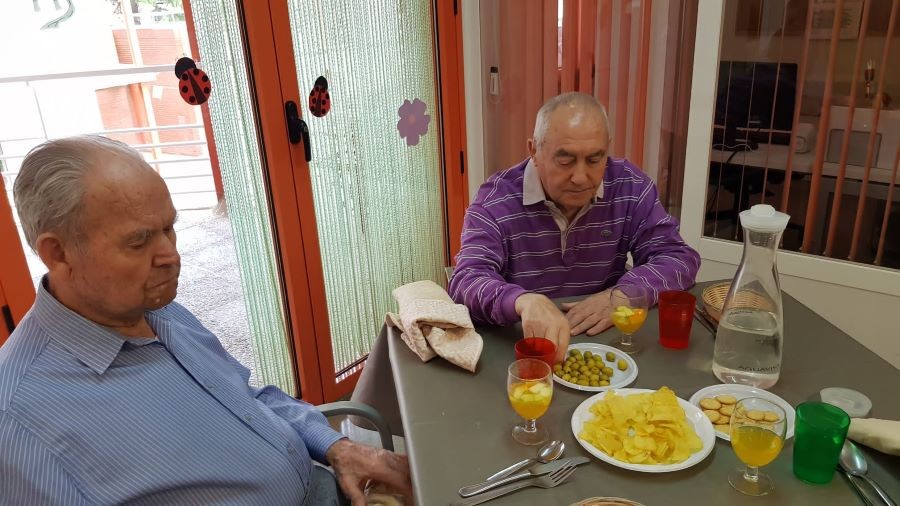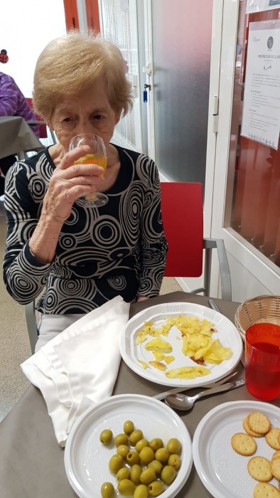 El dissabte vam sortir a la plaça de davant de la residència i el diumenge volíem fer vermut a fora del jardí però va ploure. La pluja però, no ens va impedir poder celebrar el vermut amb els nostres companys!