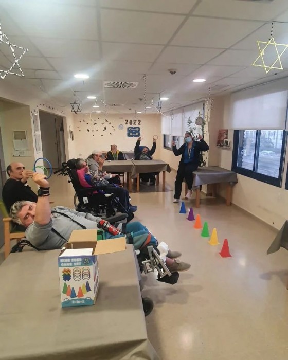 Juguem a jocs que requereixen moviment per tal d'activar-nos i fer exercici. Aquí estem jugant a les anelles. Consisteix en encertar les anelles als cons individuals que tenim cadascú, qui enecerti més anelles guanya!