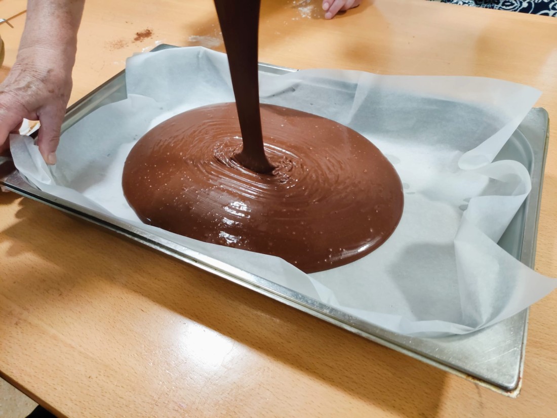 Hem realitzat un boníssim pastís de tres xocolates amb nous, que podrem degustar tots junts avui a la tarda per berenar.