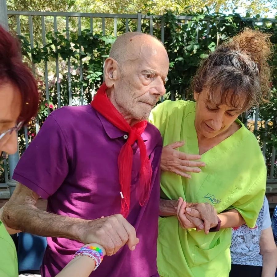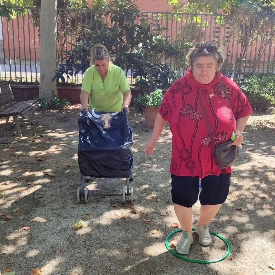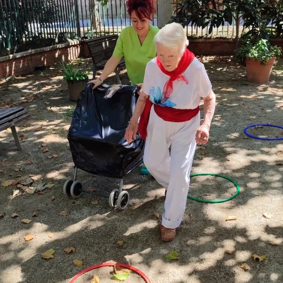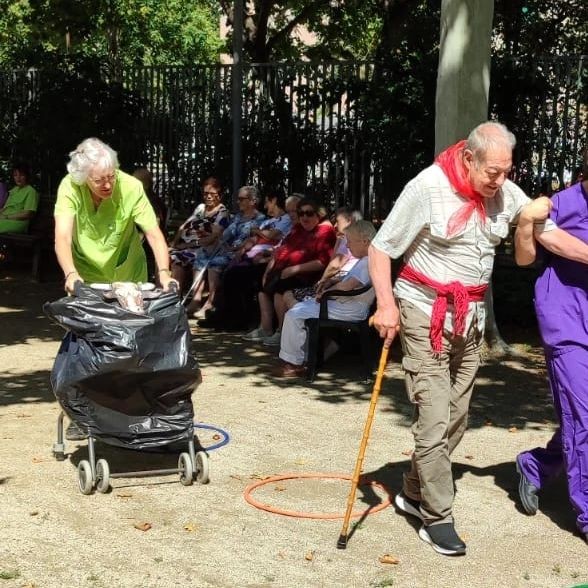 Celebramos San Fermín realizando una gincana deportiva en el jardín. Los usuarios pasan una serie de obstáculos mientras les persigue el toro.