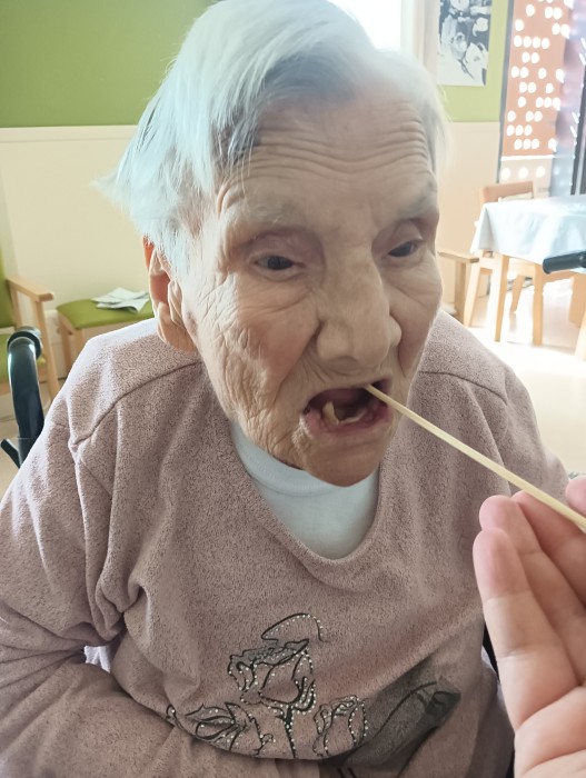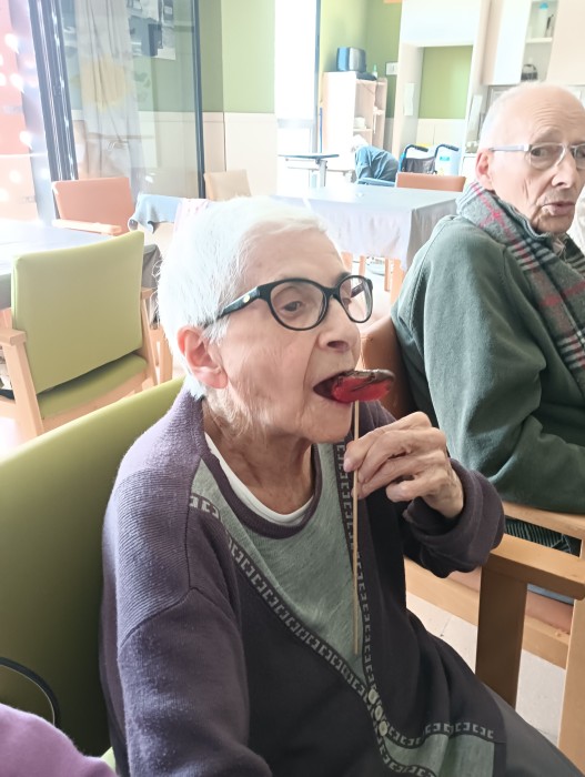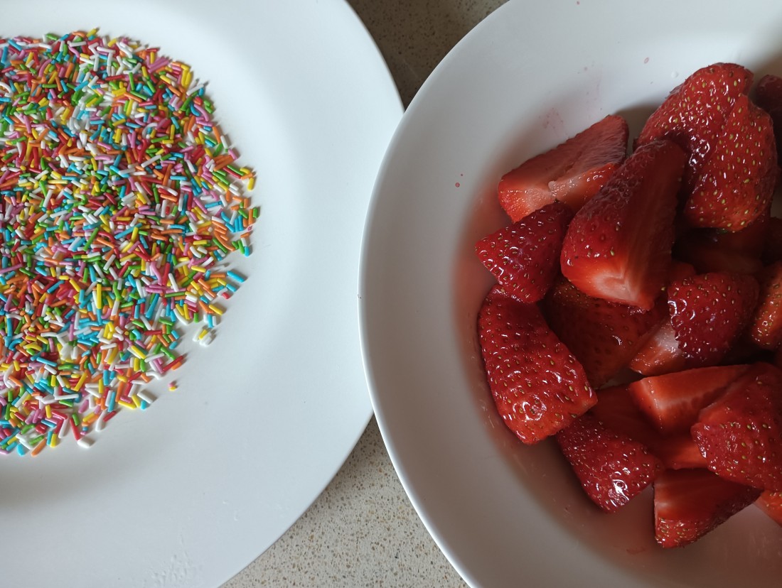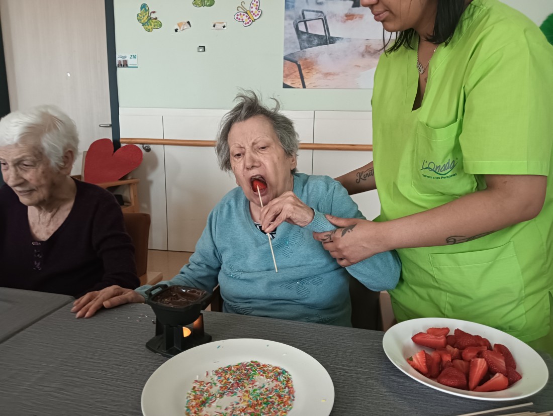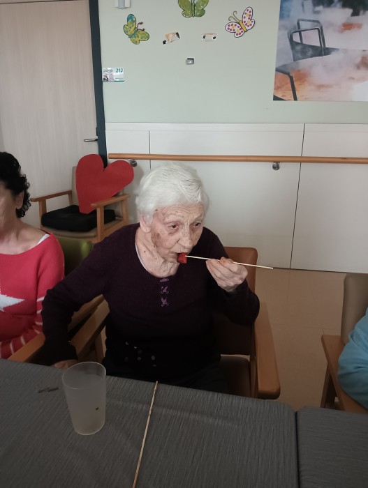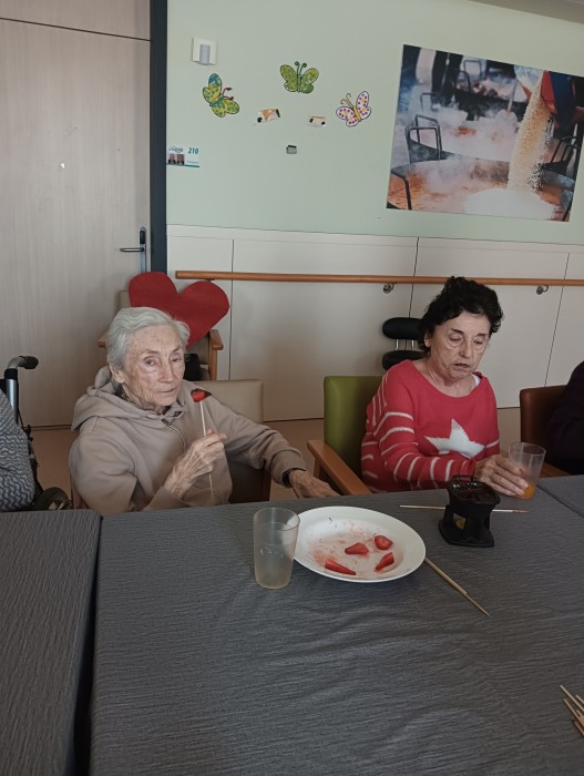 Berenar de maduixes amb xocolata a la segona planta.