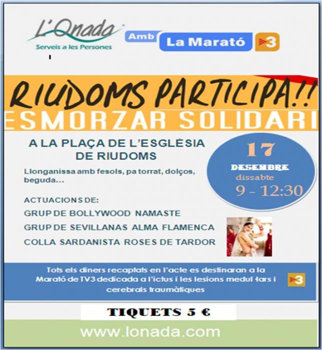 El proper dissabte 17 de desembre, celebrarem l'ESMORZAR SOLIDARI PER LA MARATÓ DE TV3. Estarem a la plaça de l'Església de Riudoms des de les 9 fins les 12:30, on podrem gaudir d'un esmorzar solidari amb llonganissa, fesols, pa torrat i dolços, entre d'altres.