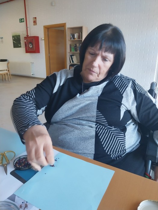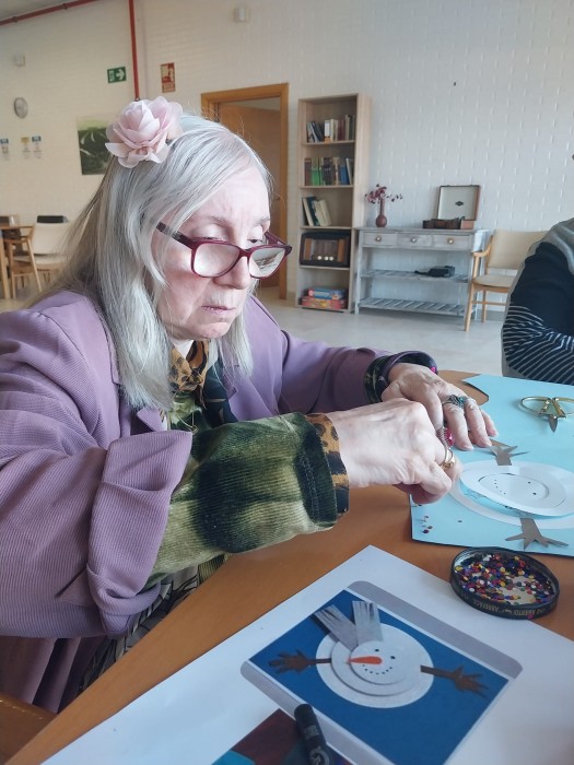 Acabada La Castanyada ja pensem amb Nadal: comencem amb les postals nadalenques. En el taller de manualitats ocupacionals, Laura de l'Institut de l'Ebre, enns ajuda amb la tasca.