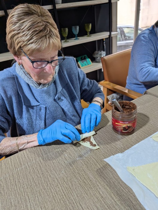 Entre tots hem preparat croissants de xocolata i hem passat una estona molt entretinguda a la cuina: estirant la massa, farcint-los de xocolata i esperant amb ganes el moment de tastar-los.