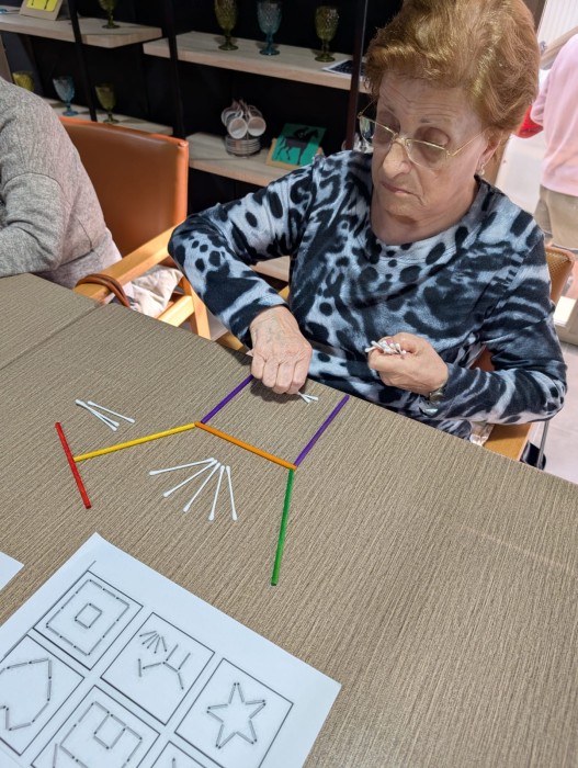 A través d’aquest exercici, treballem la motricitat fina, la coordinació ull-mà i l’orientació espacial, aspectes clau per mantenir l’autonomia en el dia a dia. A més, també estimulem la memòria, l’atenció i la capacitat de seguir instruccions, tot fomentant alhora la creativitat.
