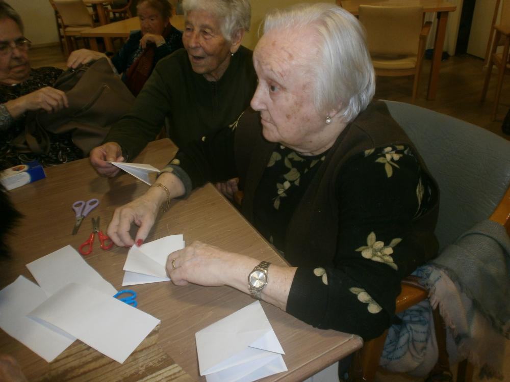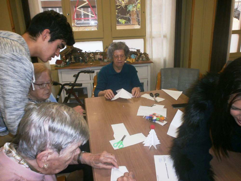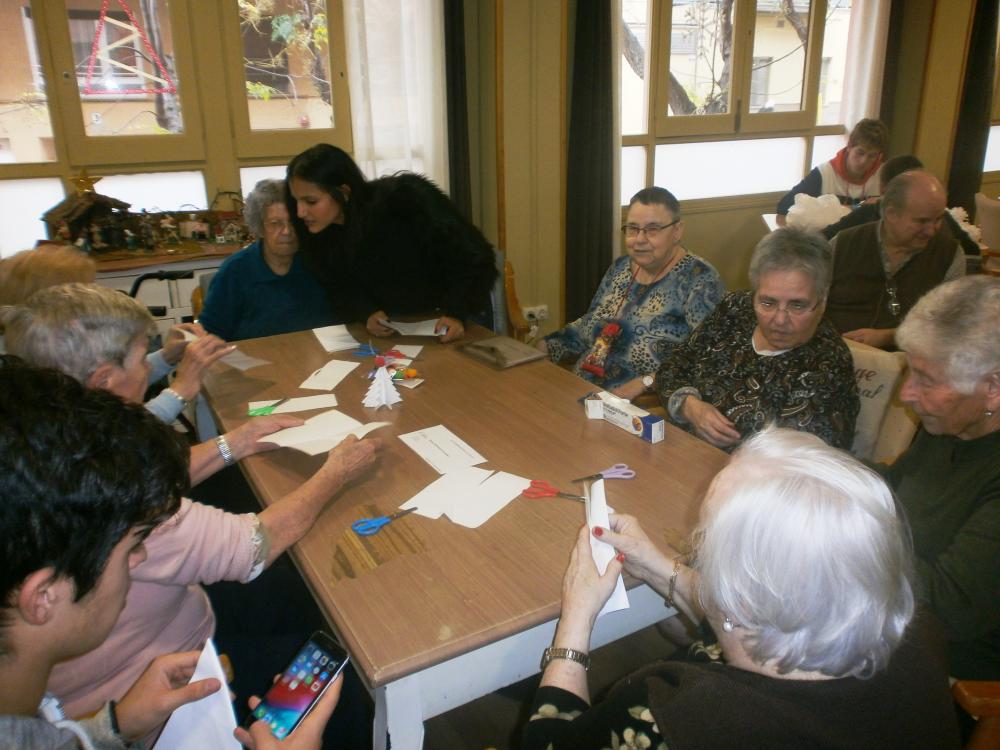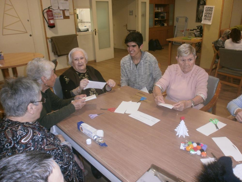 La Carmen, el Pol, el Ramon, la Clàudia i el David, cada dia ens sorprenen amb alguna activitat especial. Avui ens han ensenyat a fer uns arbres nadalencs de papiroflèxia molt originals! També hem continuat preparant la decoració nadalenca del centre.
