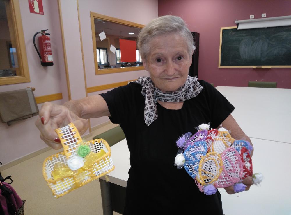 Avui volem compartir una fotografia d'unes manualitats molt originals i elaborades que confecciona la nostra resident, la sra. Annita, en les seves estones lliures. Es tracta d'uns cistells i pots fets amb malla blanca i molt ben decorats. Esperem que us agradin tant com ens agraden a nosaltres!